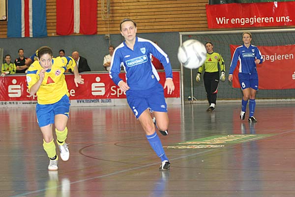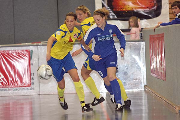 Verkehrte Welt in der Vorrunde: während in Gruppe 1 alles beim Alten blieb, Potsdam die Gruppe dominierte und Valur Reykjavic verdient ins Halbfinale einzog, gewann Djurgarden am zweiten Turniertag keine Partie mehr. Durch den 7:0-Kantersieg von Duisburg im letzten Spiel gegen Gütersloh wurde das Team von Thomas Obliers sogar noch Gruppenerster, punktgleich folgten Bröndby und das Team um Ariane Hingst, Nadine Angerer und Jenny Meier, das überraschend noch in die Platzierungsrunde musste. ![]() ![]() ![]() ![]() ![]() ![]() ![]() ![]() ![]() ![]() ![]() ![]() ![]() ![]() |