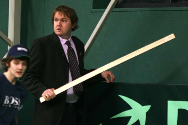 in die Bredouille: zwar führte der Este 30-15, machte dann aber einen Doppelfehler und versagte dann nach einem schwachen Schlag von Zemlja mit einem